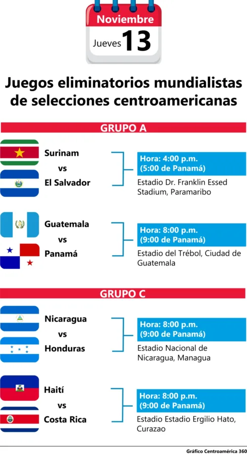 Este 13 de noviembre promete emociones intensas en la región. Las selecciones de El Salvador, Guatemala, Panamá, Nicaragua, Costa Rica y Honduras saldrán al campo en una jornada crucial de las eliminatorias mundialistas de la Concacaf rumbo a Norteamérica 2026, donde cada punto puede decidir el futuro.