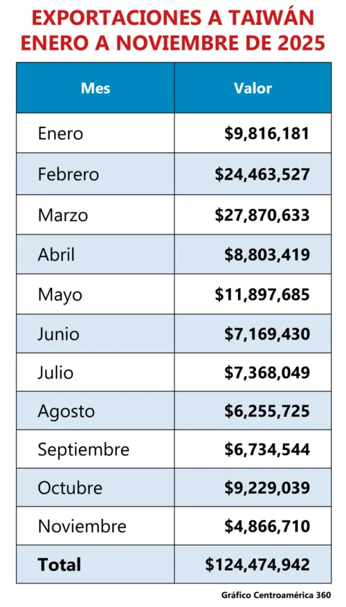 Datos oficiales indican que Guatemala exportó a Taiwán, hasta noviembre, productos por un valor superior a $124 millones en 2025, con un flujo constante a lo largo del año y una fuerte demanda de azúcar, camarón, café y banano.