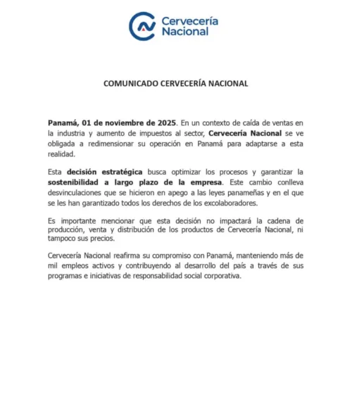 El 1 de noviembre de 2025, Cervecería Nacional anunció un redimensionamiento de su operación en Panamá, que incluye la desvinculación de parte de su personal.