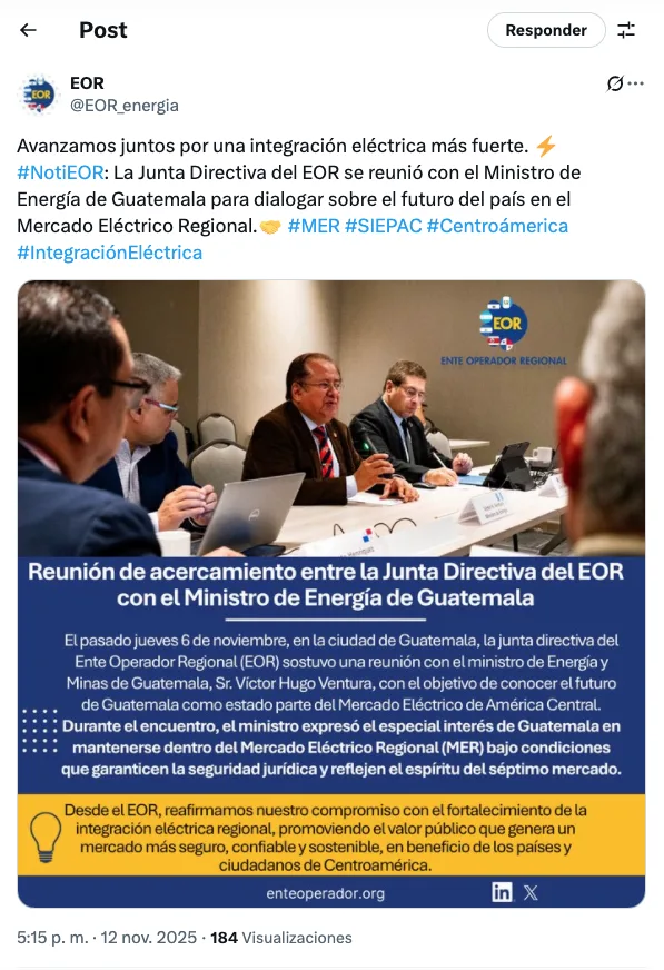 El Ente Operador Regional (EOR) informó que el 6 de noviembre sostuvo una reunión con el ministro de Energía y Minas de Guatemala, Víctor Hugo Ventura, en la que se abordó el futuro del país dentro del MER.