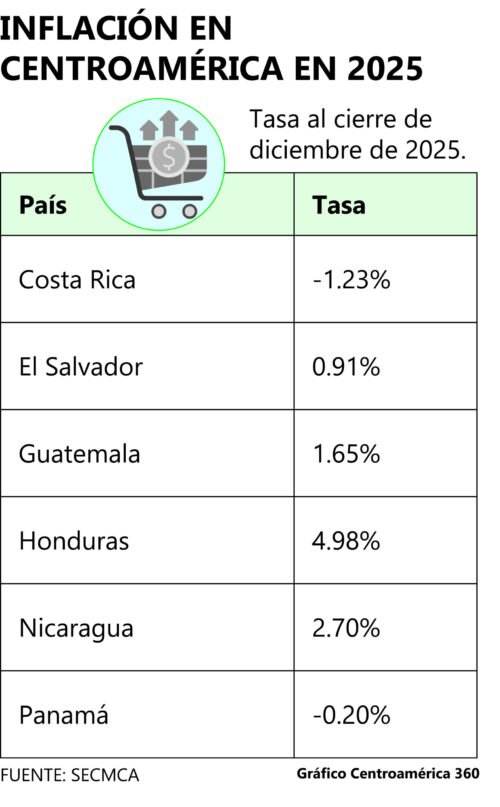 Con estos resultados, El Salvador se posicionó como el país con la inflación más baja de Centroamérica, Honduras como el de mayor alza de precios, y Panamá y Costa Rica como las únicas economías en deflación, es decir, con caída generalizada de precios.