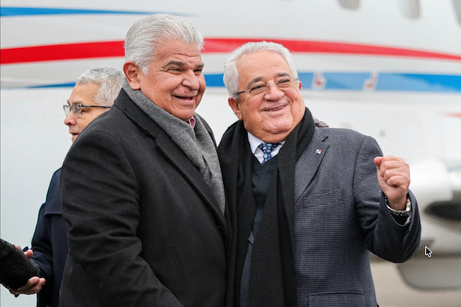 El presidente panameño, José Raúl Mulino (izq.) a su llegada a Davos, Suiza.