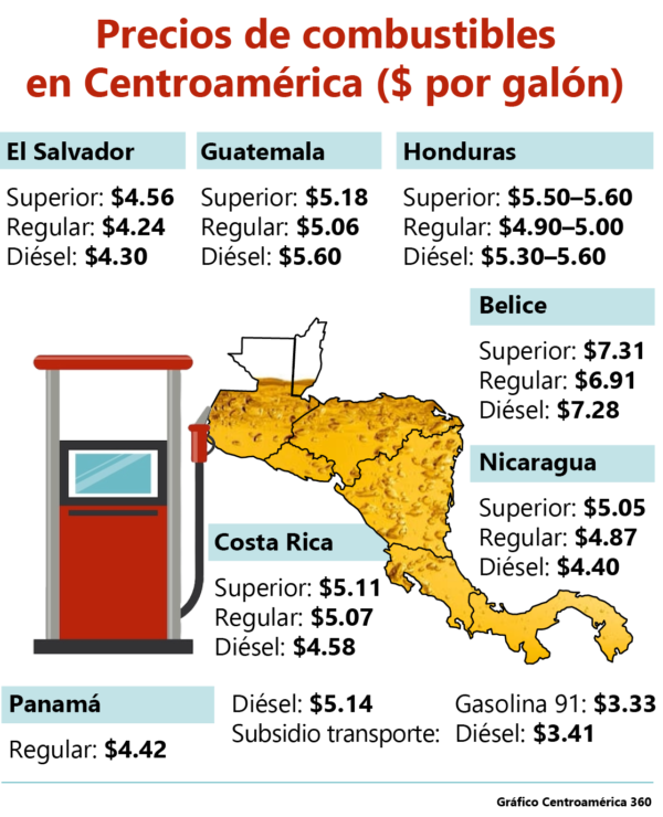 Los precios de los combustibles en Centroamérica superan los $5 por galón en la mayoría de países y alcanzan hasta $7 en algunos mercados. La tendencia responde al alza internacional del petróleo y ha obligado a los gobiernos a aplicar subsidios, congelamientos y ajustes periódicos.