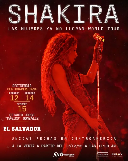 La cantante Shakira anunció una residencia musical en El Salvador con 3 conciertos consecutivos. Se realizarán el 12, 14 y 15 de febrero de 2026 en el Estadio Mágico González. El evento convertirá al país en un punto clave para el entretenimiento en Centroamérica, según informaron los organizadores.