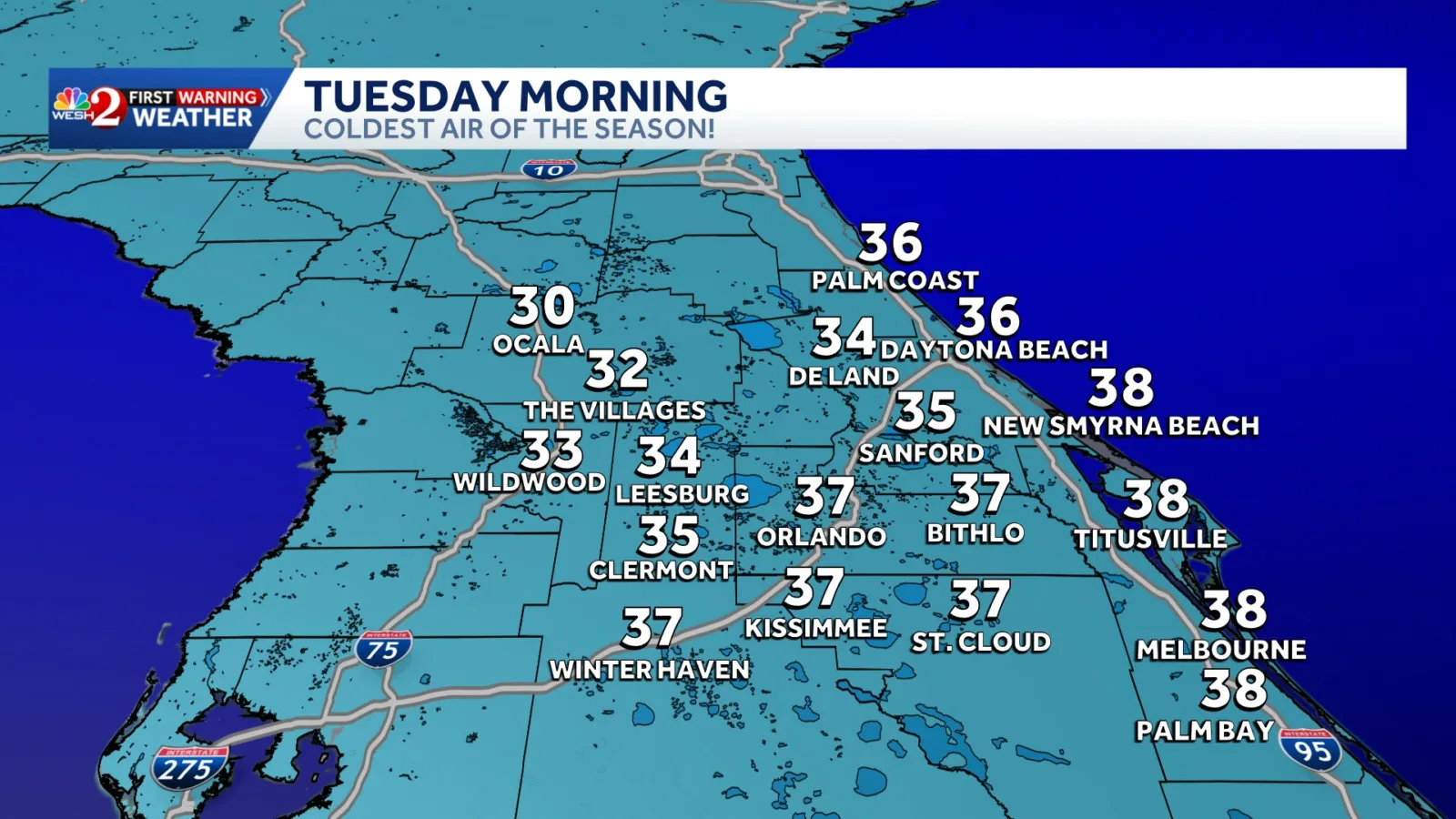 El NWS indicó que el aire más frío de la temporada se mantendrá hasta la noche del martes. Habrá sensaciones térmicas cercanas a los -2 °C en algunas zonas del sureste. Las condiciones comenzarán a mejorar gradualmente hacia el jueves. Aunque, se prevé que persistan temperaturas bajas durante las noches.