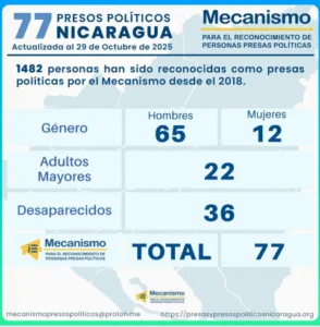 El más reciente informe del Monitoreo Azul y Blanco registró 77 personas presas políticas en Nicaragua al cierre de octubre, de las cuales 36 permanecen en condición de desaparición forzada.