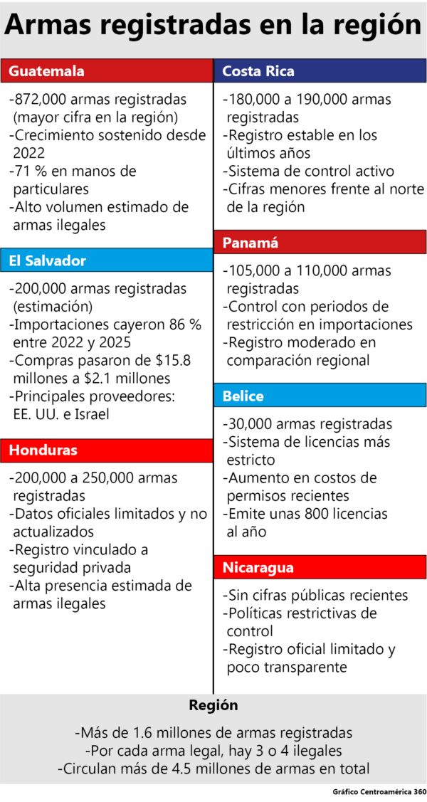 El registro de armas en Centroamérica muestra diferencias marcadas entre países, con Guatemala a la cabeza con más de 800,000 armas legales. En paralelo, El Salvador reporta una caída del 86 % en importaciones de armas en los últimos años.