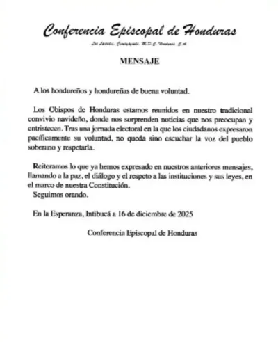 La Conferencia Episcopal de Honduras emitió este martes un llamado urgente a la paz y al respeto de la voluntad popular, en medio del clima de tensión posterior a las elecciones generales del 30 de noviembre.