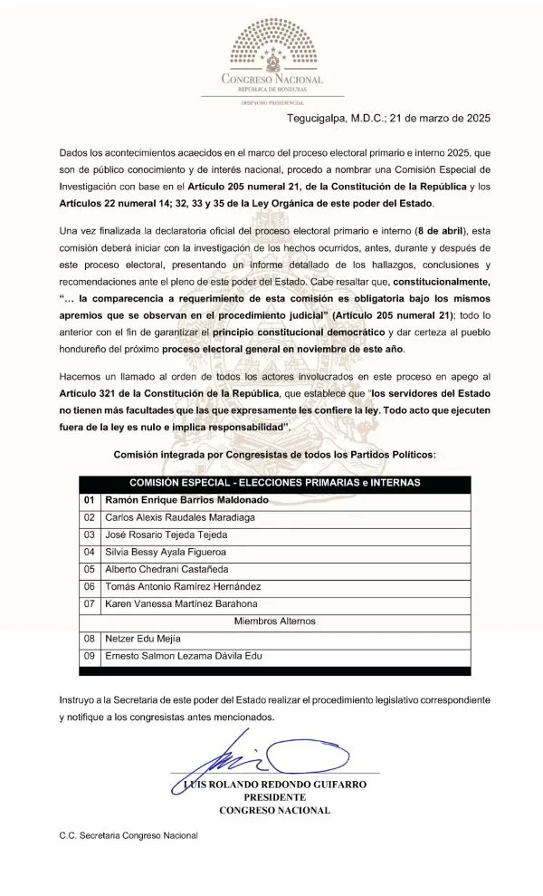 En respuesta a los eventos ocurridos durante las elecciones primarias e internas del 9 de marzo de 2025, el presidente del Congreso Nacional, Luis Redondo, designó una comisión especial de investigación para esclarecer lo sucedido antes, durante y después de este proceso electoral, el cual ha generado gran interés y preocupación a nivel nacional.
