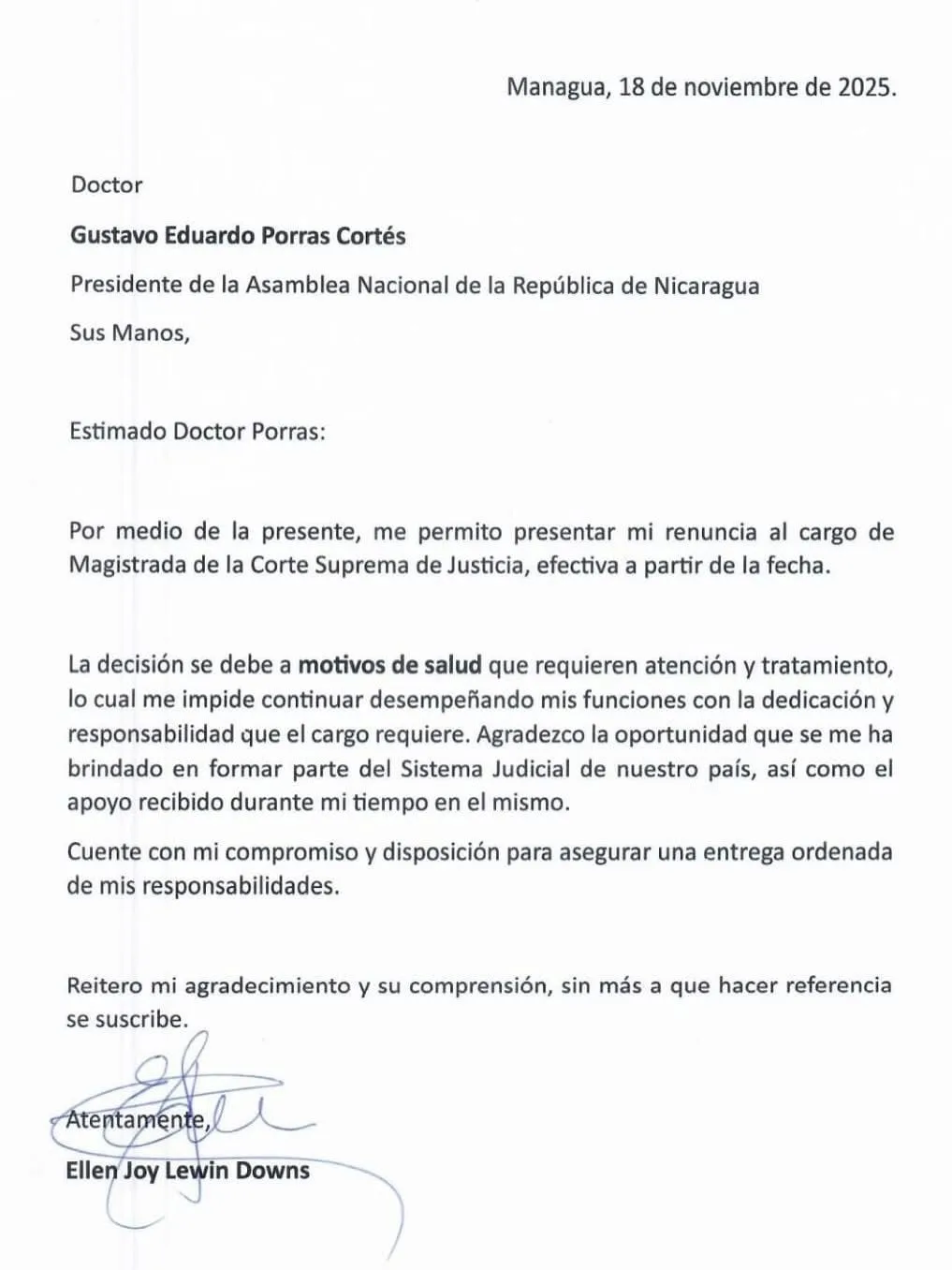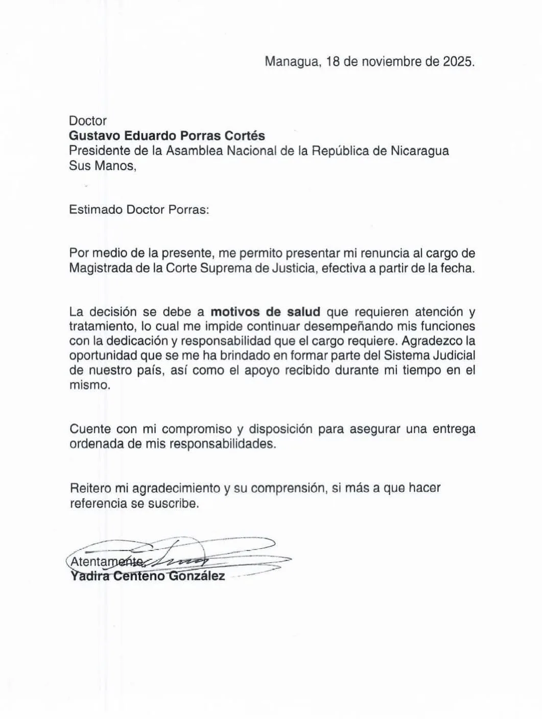 La Asamblea Nacional aceptó este jueves las renuncias de las magistradas Yadira Centeno González y Ellen Joy Lewin Downs, ambas figuras históricamente vinculadas al FSLN, quienes alegaron “motivos de salud”.