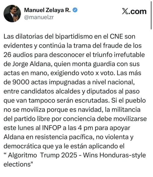 En un mensaje difundido en redes sociales, Zelaya sostuvo que el CNE mantiene bloqueado el escrutinio de miles de actas. Aseguró que más de 9,000 actas impugnadas a nivel nacional no avanzan en el proceso de revisión.