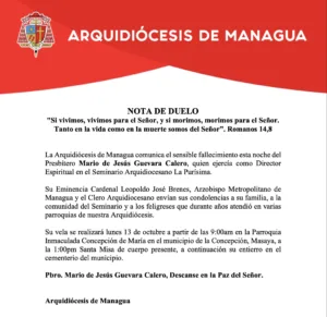 El cardenal Leopoldo José Brenes, arzobispo metropolitano de Managua, junto con el clero arquidiocesano, expresó sus condolencias a los familiares del sacerdote. También lo hizo con la comunidad eclesial que acompañó su ministerio.