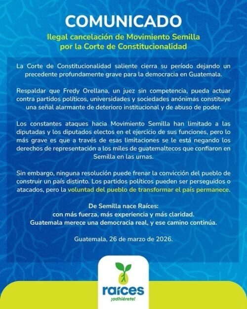 El movimiento político Raíces calificó como “ilegal” la cancelación del Movimiento Semilla. La agrupación afirmó que la resolución, avalada por la Corte de Constitucionalidad, establece un precedente grave para la democracia en Guatemala.