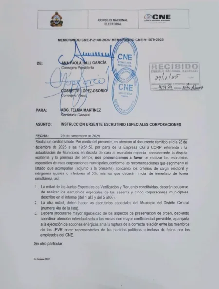 En este contexto, la presidenta del CNE, Ana Paola Hall, ordenó iniciar el escrutinio especial en 66 alcaldías (de 298). La instrucción quedó plasmada en un documento dirigido a la secretaria del organismo, Telma Martínez.