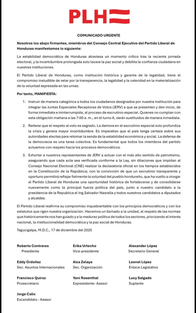 El candidato presidencial del Partido Liberal, Salvador Nasralla, desconoció un comunicado atribuido a su partido que instruye iniciar de inmediato el escrutinio especial. Aseguró que el documento carece de validez institucional y afirmó que no fue discutido ni aprobado por el Consejo Central Ejecutivo.