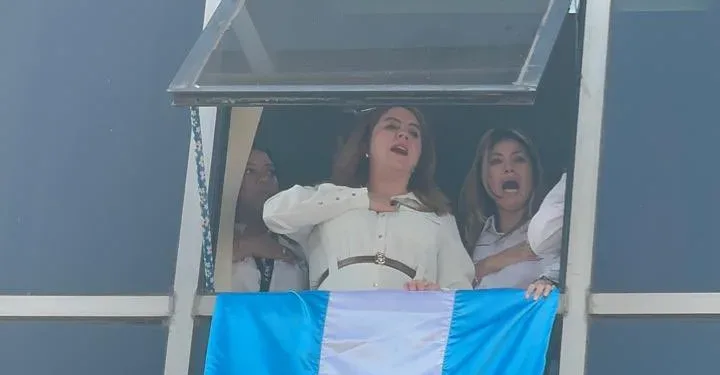 Cossette López, presidenta del CNE, salió desde la ventana de sus oficinas para saludar a los ciudadanos y a los miembros de su partido, quienes se habían congregado para mostrarles su solidaridad.