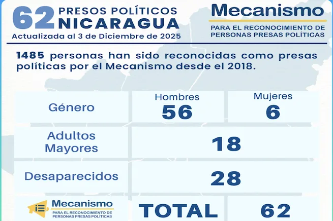 El más reciente informe del Mecanismo para el Reconocimiento de Personas Presas Políticas en Nicaragua señala que, hasta el 2 de diciembre de 2025, se han identificado 62 personas como presas por motivos políticos, una reducción con respecto al reporte anterior, que contabilizaba 77 casos.