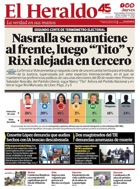 Aunque Nasralla mantiene la delantera, la encuesta refleja un electorado dividido, entre el deseo de un cambio político y una profunda desconfianza en las instituciones.