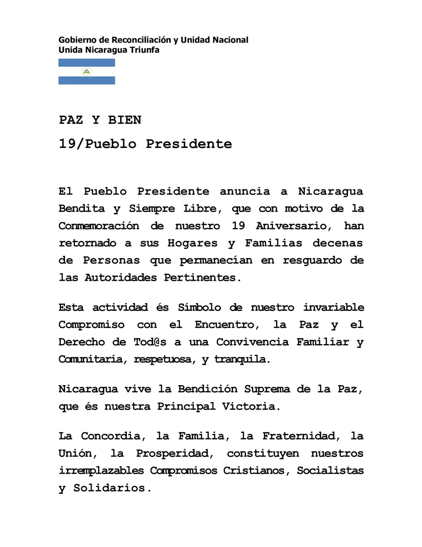 En la misiva, el régimen señaló que la excarcelación se realizó “con motivo de la conmemoración de nuestro 19 aniversario” y afirmó que las personas detenidas “retornaron a sus hogares y familias”, tras haber estado “en resguardo de las autoridades pertinentes”.