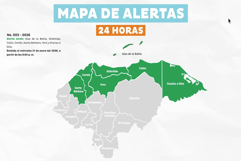 Los departamentos bajo alerta son Islas de la Bahía, Atlántida, Colón, Cortés, Santa Bárbara, Yoro y Gracias a Dios. Esta disposición entra en vigencia a partir de las 9:00 p. m. de este miércoles 21 de enero y tendrá una duración de 24 horas, con posibilidad de extensión dependiendo del comportamiento climático.