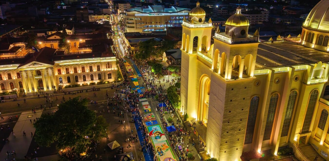 La alfombra se extendió desde la Catedral Metropolitana de San Salvador hasta la Plaza Simón Bolívar, cruzando de poniente a oriente. En total, cubrió más de un kilómetro en el corazón de la capital.