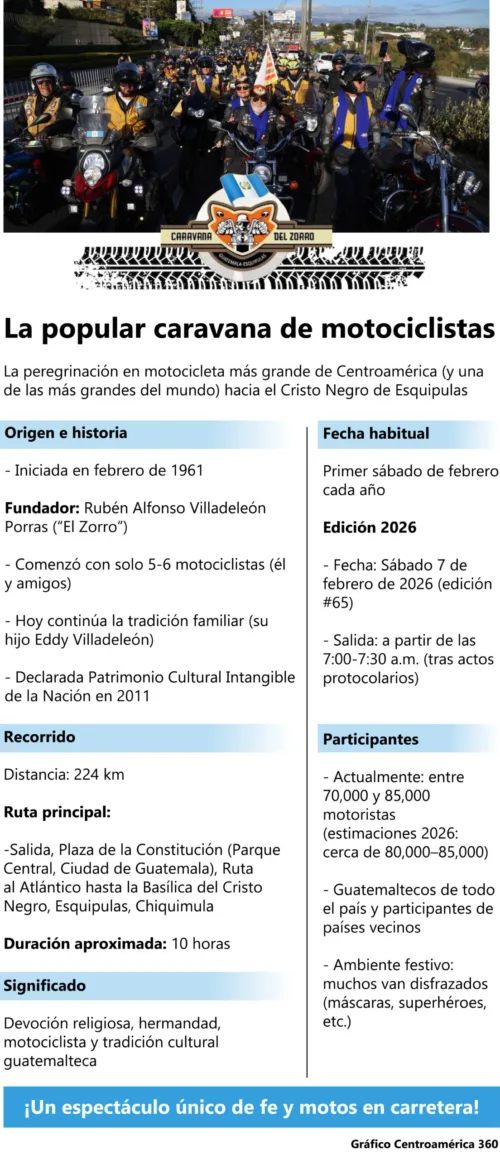 La Caravana del Zorro 2026 congrega a más de 80,000 mil motociclistas en una de las peregrinaciones más numerosas no solo de Guatemala, sino de Latinoamérica. El evento se realizará este sábado, con destino a la Basílica del Cristo Negro de Esquipulas, en Chiquimula.