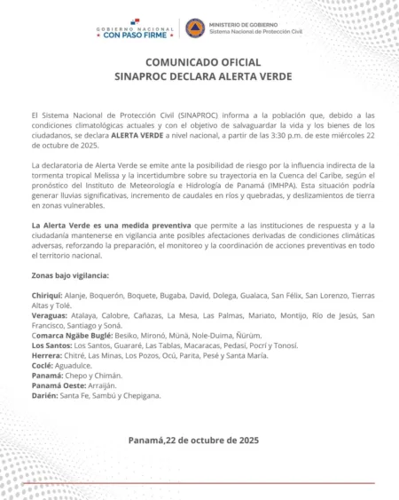 El Sistema Nacional de Protección Civil (SINAPROC) de Panamá mantiene la alerta verde preventiva en gran parte del territorio nacional, debido a la intensificación de lluvias y tormentas generadas por la influencia indirecta de la tormenta tropical Melissa.