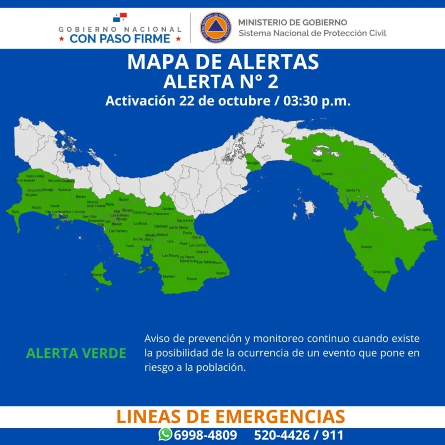 El Sistema Nacional de Protección Civil (SINAPROC) de Panamá mantiene la alerta verde preventiva en gran parte del territorio nacional, debido a la intensificación de lluvias y tormentas generadas por la influencia indirecta de la tormenta tropical Melissa.