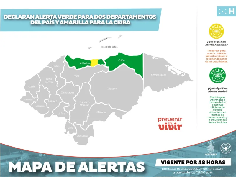 La ciudad portuaria de La Ceiba, está en alerta amarilla debido a la amenaza de intensas lluvias y el resto del departamento de Atlántida, al que pertenece, se encuentra en verde, por disposición de la Secretaría de Gestión de Riesgos y Contingencias Nacionales.