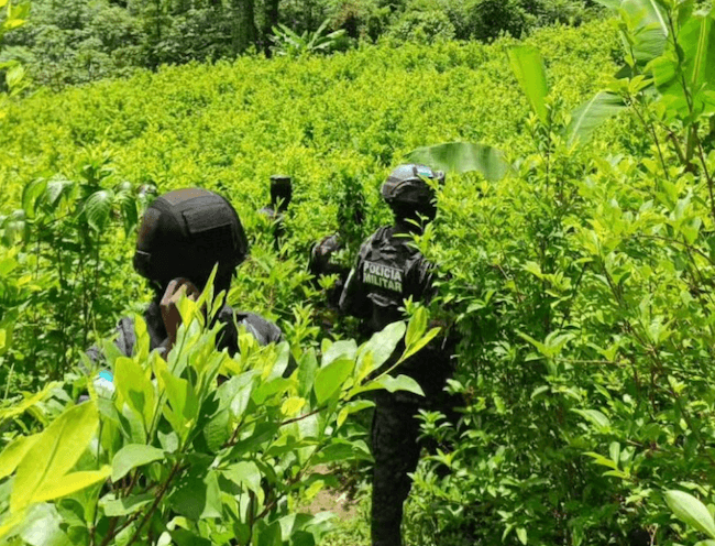 “Las Fuerzas Armadas a través de unidades especiales de investigación de la Dirección de Información Estratégica y unidades operativas de la Policía Militar del Orden Público aseguró una plantación con 180 mil arbustos de coca cultivadas en 35 manzanas de tierra”, informó la institución en un comunicado.