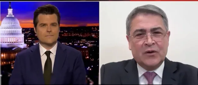 El indultado expresidente de Honduras, Juan Orlando Hernández, al ser entrevistado por Matt Gaetz.