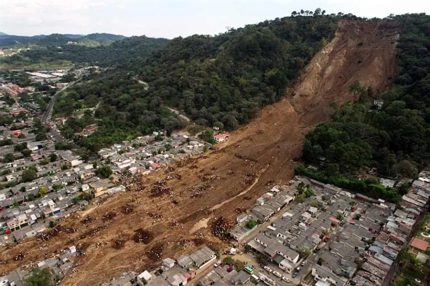 Uno de los episodios más graves ocurrió en la colonia Las Colinas, en Santa Tecla. Un deslizamiento de tierra sepultó cerca de 200 viviendas en pocos minutos.