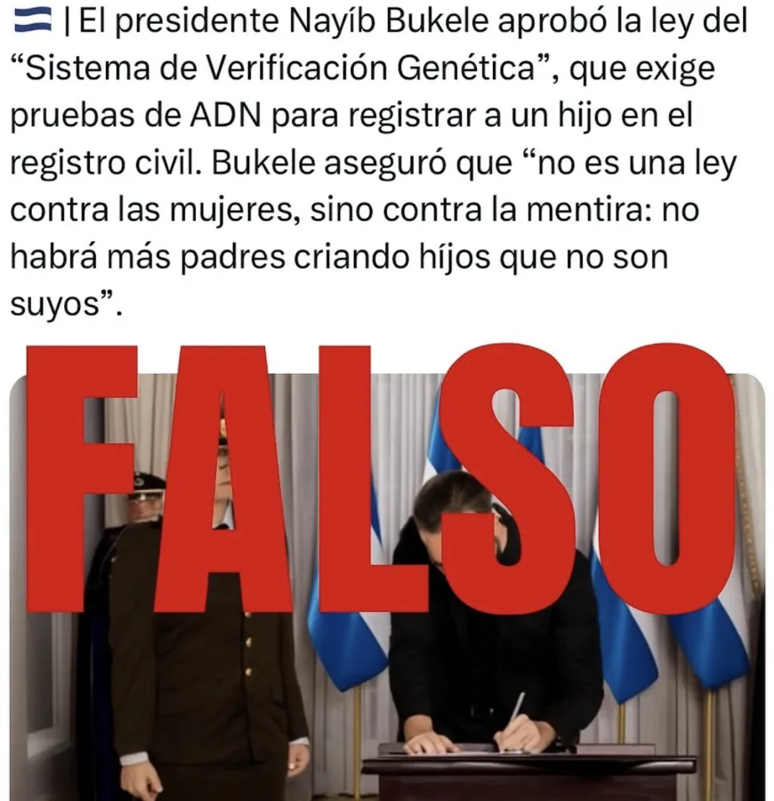 Además, las autoridades informaron que el presidente Nayib Bukele no ha firmado ninguna ley relacionada con un Sistema de Verificación Genética para procesos registrales.