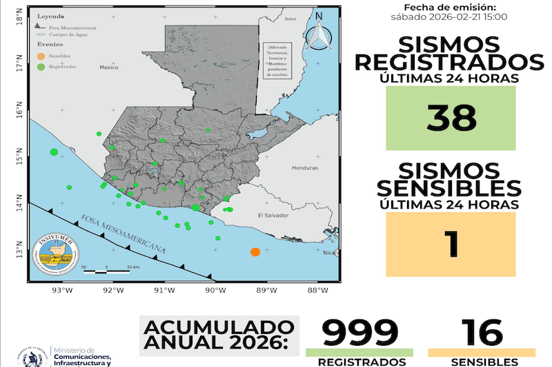 El departamento especializado en sismos del Instituto Nacional de Sismología, Vulcanología, Meteorología e Hidrología (Insivumeh) informó que, desde el 1 de enero hasta este sábado 21 de febrero de 2026, se han registrado 999 temblores en Guatemala, de los cuales únicamente 16 fueron reportados como sensibles por la población.
