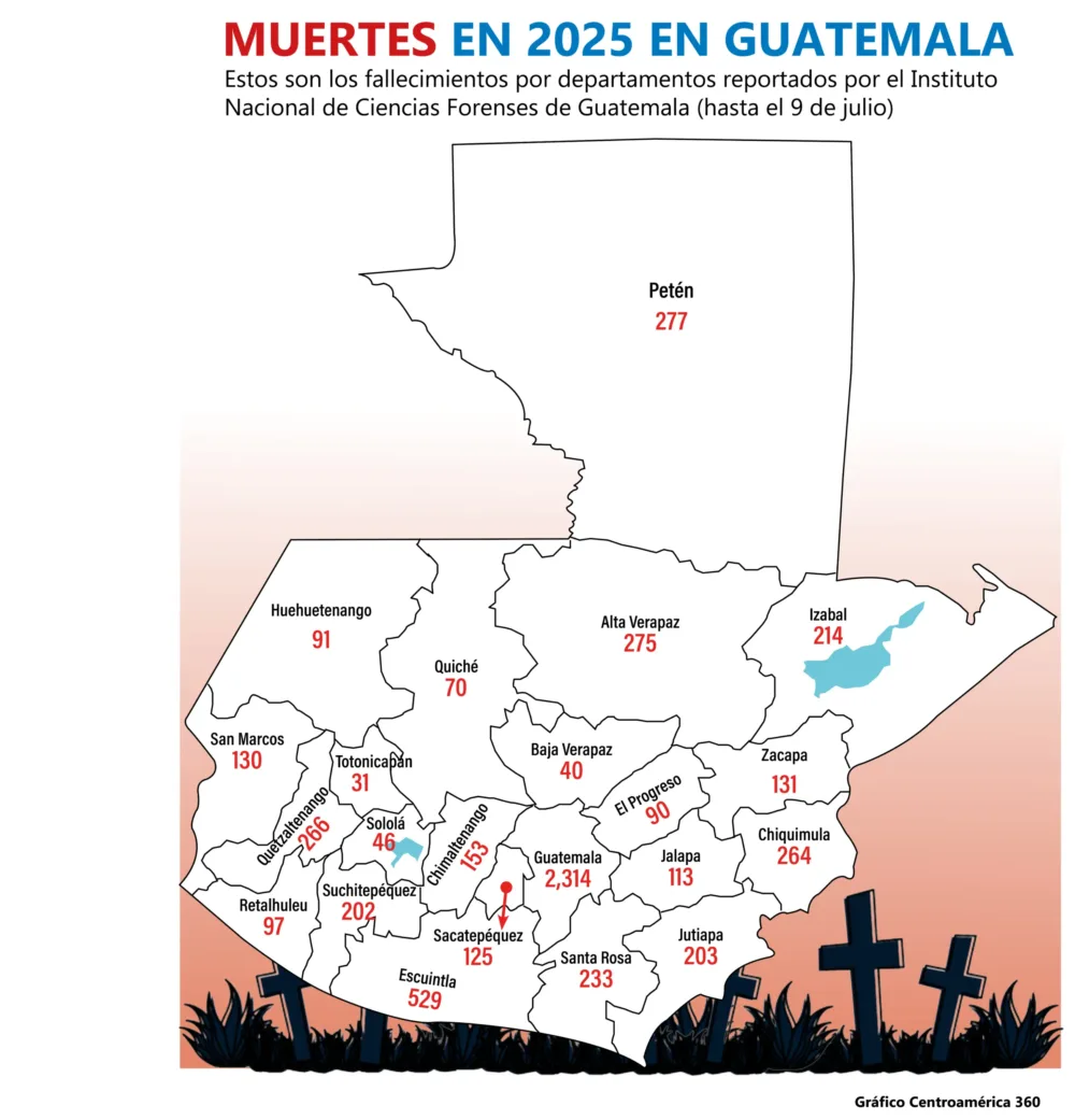 Guatemala es el departamento con más muertes forenses registradas en este país entre enero y julio de 2025, con 2,314 casos según el Instituto Nacional de Ciencias Forenses (Inacif), una cifra que contrasta con departamentos como Sololá, donde solo se reportan 46 fallecimientos y las causas varían: en el primero predominan los homicidios por arma de fuego, mientras que en el saegundo resaltan traumas y causas naturales.