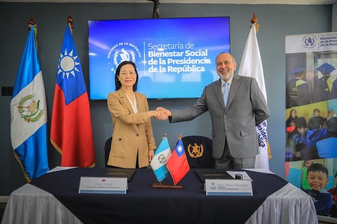 La embajadora de la República de China (Taiwán), Vivia Chang junto al secretario de Bienestar Social de Guatemala, Marvin Rabanales García, tras suscribir el acuerdo.