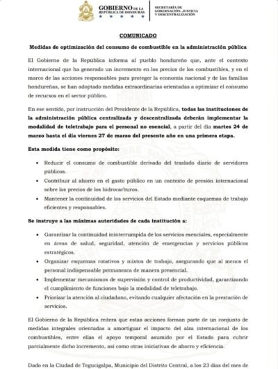 Honduras anunció que implementará el teletrabajo en el sector público por al menos 15 días ante el alza del precio de los combustibles que afecta a todo el mundo por el conflicto en Medio Oriente.