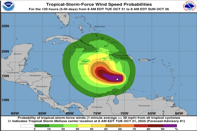 El Centro Nacional de Huracanes advierte que la tormenta tropical Melissa dejará lluvias intensas, riesgo de inundaciones y deslizamientos en Haití, República Dominicana y Jamaica.