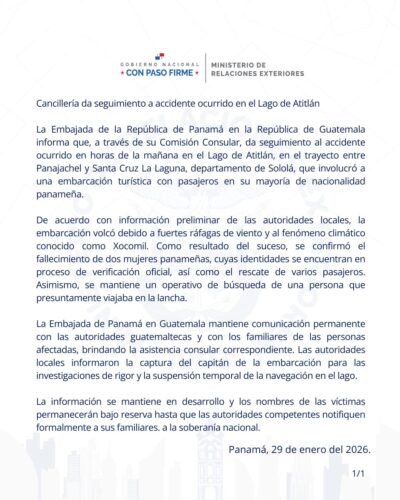 La Cancillería de Panamá informó que mantiene seguimiento al accidente de una embarcación turística en el Lago de Atitlán, ocurrido en el trayecto entre Panajachel y Santa Cruz La Laguna, en el departamento guatemalteco de Sololá. En el percance fallecieron 2 ciudadanas panameñas.