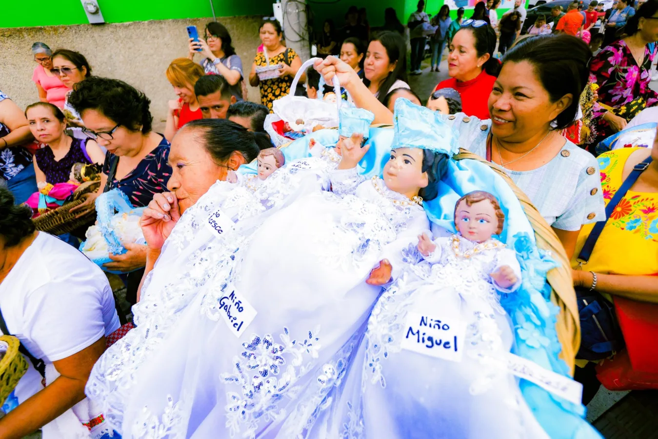 Las personas portan figuras del Niño Dios como expresión de devoción y agradecimiento. Los organizadores habilitan espacios del templo para el resguardo de las imágenes.