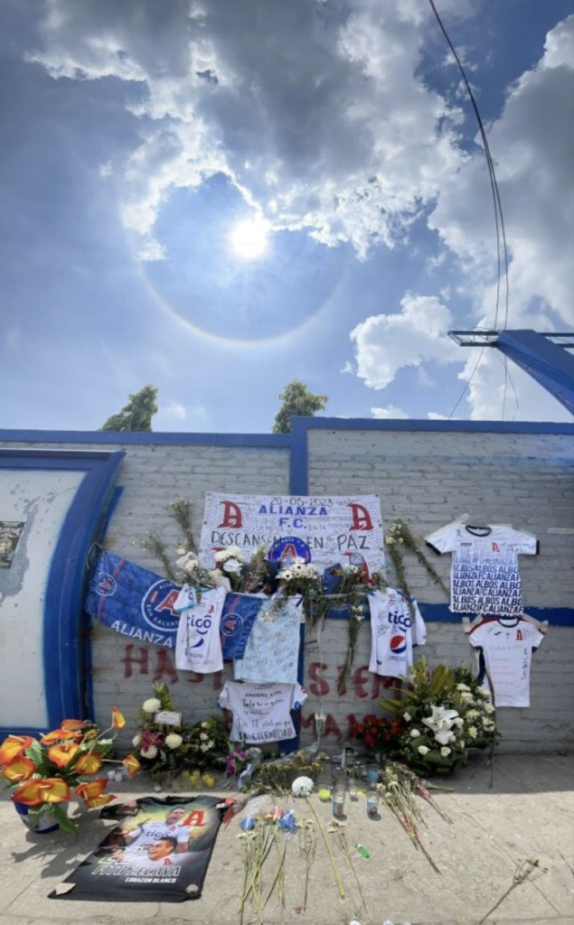 Hay camisetas con sentidos mensajes, flores, velas y banderas. Dicen los lugareños que incluso han llegado a rendir tributo hasta quienes no son seguidores del equipo paquidermo, como le llaman en El Salvador.