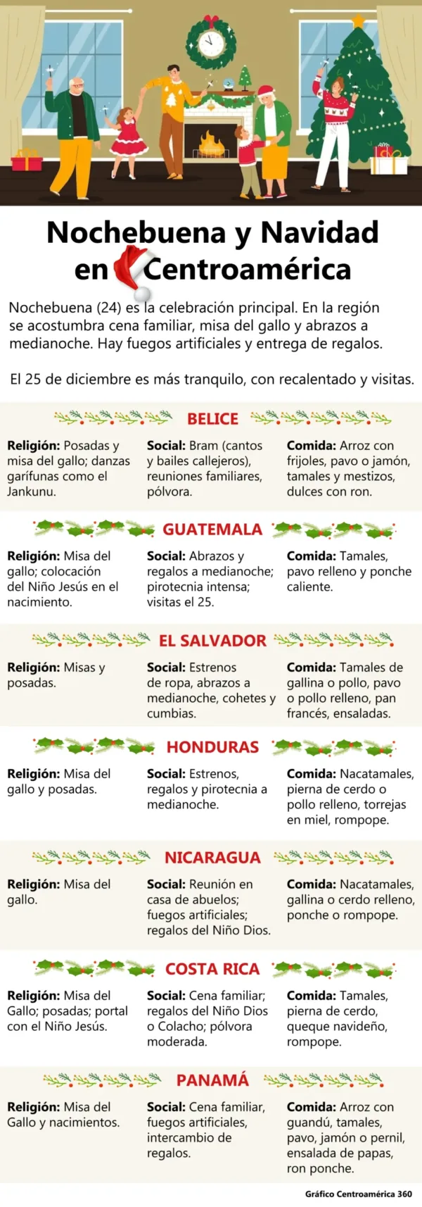 En la mayoría del istmo, la Nochebuena se celebra con temperaturas cercanas a los 26 grados centígrados, aunque en Guatemala, las temperaturas disminuyen considerablemente en esta época. Aun así, la religiosidad y la convivencia familiar marcan estas fiestas.